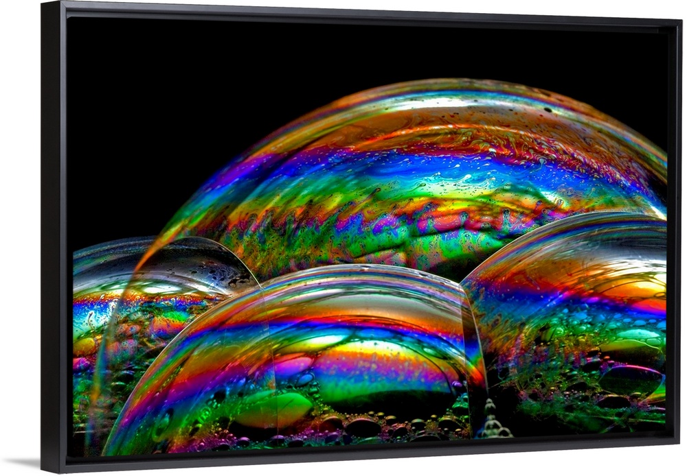 <p>Soap bubble iridescence. Iridescence is the property of certain surfaces to change colour depending on the angle of light refraction or reflection, or the angle of view. The colours are due to interference of light waves reflected from the upper and lower surfaces of the soap bubble film. The interference patterns appear as bands of colour, related to the thickness of the film. Thicker walls cause interference at longer (redder) wavelengths, so appear bluer and greener. As the film thins by evaporation, the reflected light cancels out yellow then green then blue light, appearing blue, magenta and golden yellow, before becoming too thin to support itself, and popping.</p>