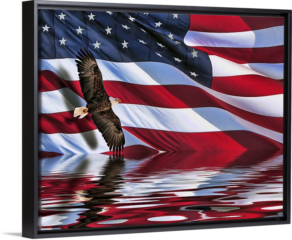 <p>A composite of two photos. One of a bald eagle, the other of a large American flag. Photos composited and then flood filter effectused for reflection</p>