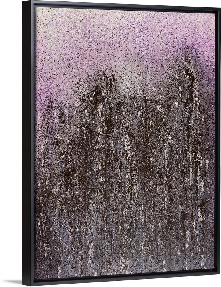 <p>Contemporary abstract painting with purple and dark hues splattered lightly at the top and densely at the bottom.</p>