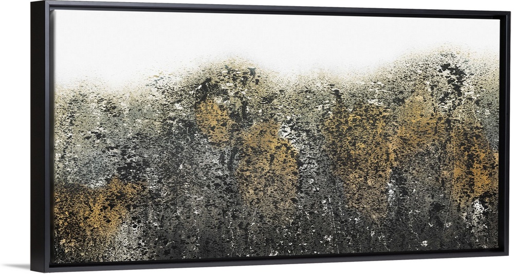 <p>Contemporary abstract painting with black, gold, and white paint splatter.</p>