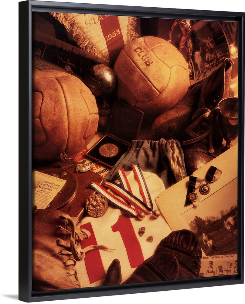 <p>Photograph of vintage soccer gear and memorabilia.</p>