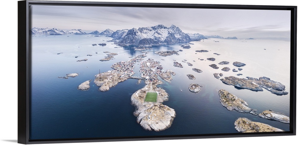 <p>Panoramic aerial view of soccer pitch and islets, Henningsvaer, Vagan municipality, Lofoten Islands, Nordland, Norway, Europe</p>
