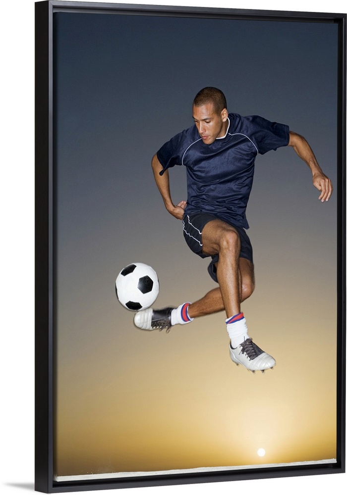 <p>Soccer player kicking ball in mid-air</p>