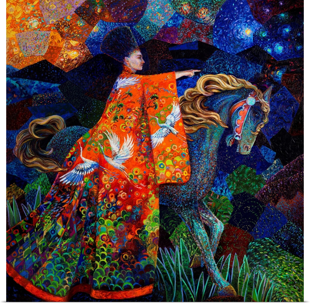 <p>Brightly colored contemporary artwork of a woman in orange robes riding a horse.</p>