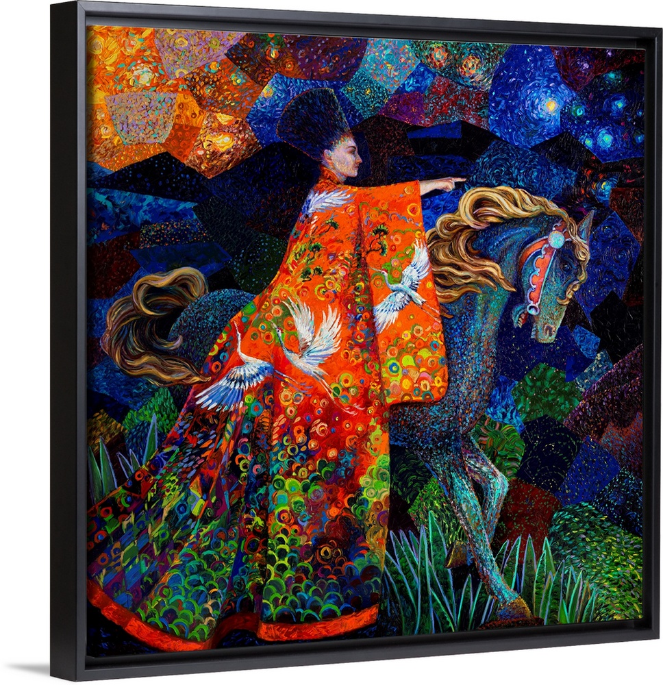 <p>Brightly colored contemporary artwork of a woman in orange robes riding a horse.</p>