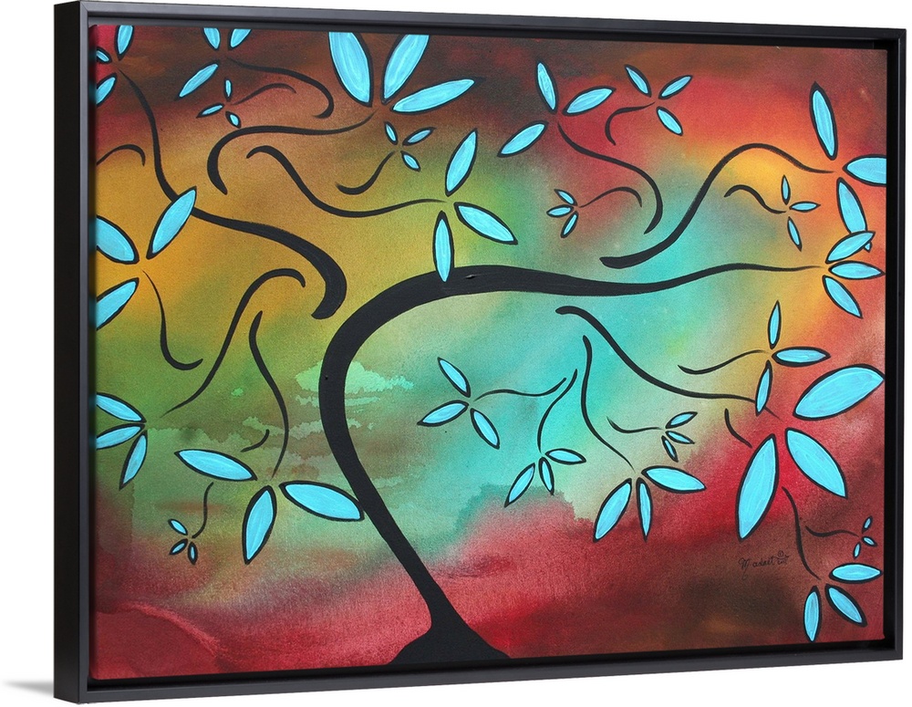 <p>This is a whimsical, original painting in beautiful, bold contrasting shades of golden yellow, teal and mauve burgundy. This abstract art features aqua blossoms radiating from the twisting branches of a barren tree. The black silhouette of the tree creates contrast, depth and mystery. This is a beautiful and contemporary, modern piece of artwork for your home.</p>