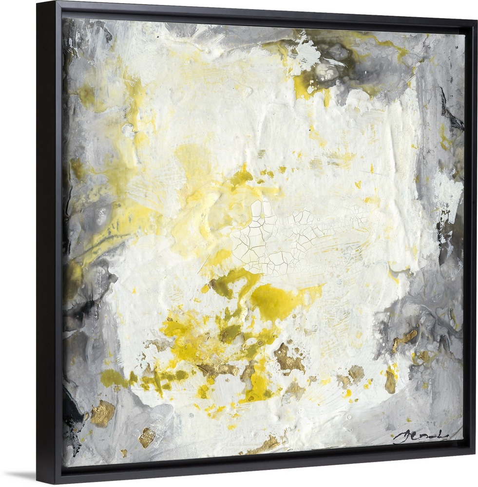 <p>Abstract painting with a heavy impasto effect with yellow splatters on white and grey.</p>