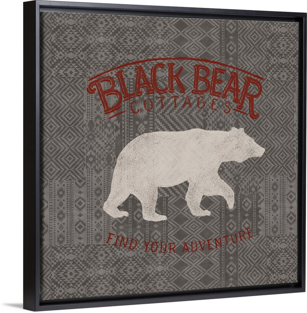 <p>"Black Bear Cottages" "Find Your Adventure" written in red on a gray patterned background with a white silhouette of a bear in the center.</p>
