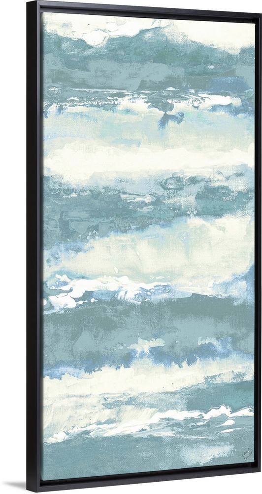 <p>A contemporary abstract painting with sea blue and white colors creating horizontal layers.</p>