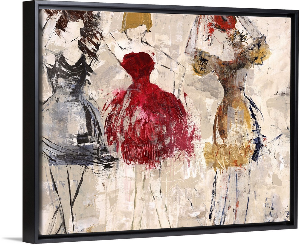 <p>Contemporary painting of three female figures wearing colorful dresses.</p>