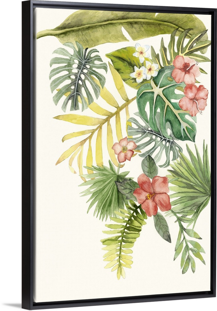 <p>Watercolor painting of a collection of tropical leaves and flowers.</p>