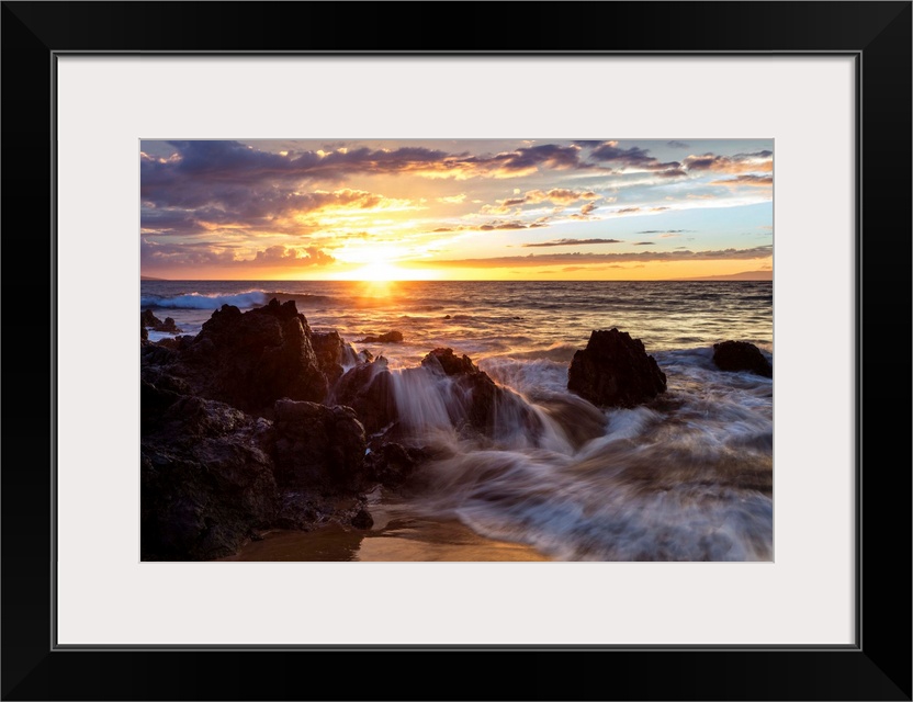 <p>Soft water over lava rocks during sunset; Makena, Maui, Hawaii, United States of America.</p>