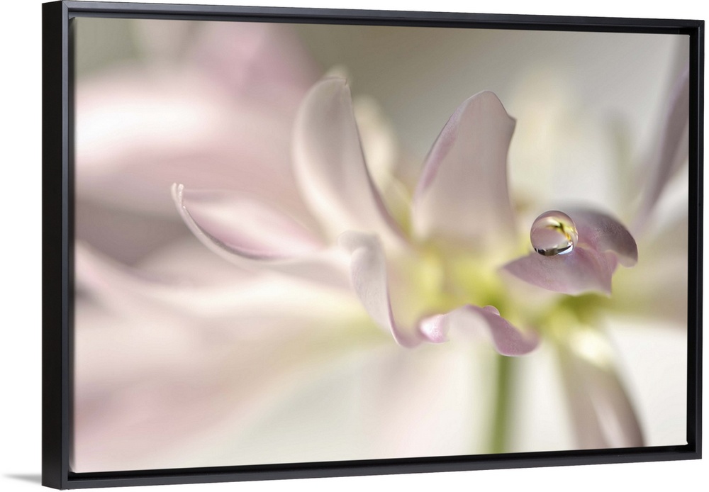 <p>A macro photograph of a water droplet sitting on the end of a soft pink flower petal.</p>