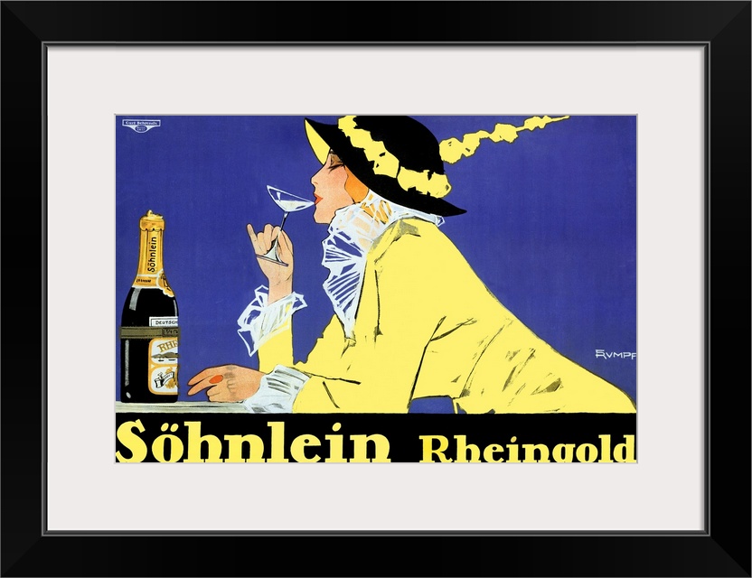 <p>Large vintage artwork for an office or living room of a beautiful, well-dressed woman casually sipping a glass of Sohnlein Rheingold while the bottle sits in front of her.</p>