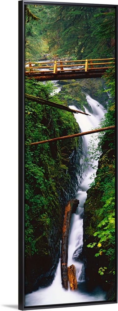 <p>This long, vertical photograph was taken with the time lapsed technique to capture the continuous cascade of water through the rocks and dense foliage growing in the forest.</p>