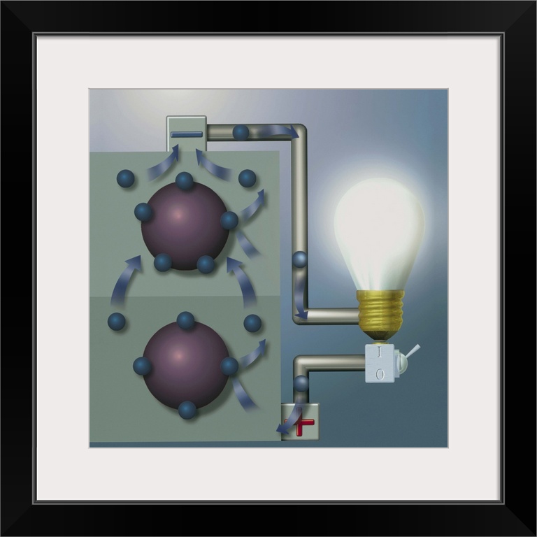 <p>Solar cell (image 3 of 3). Computer illustration of a solar cell discharging. Solar cells convert sunlight into electricity. This cell has 2 layers of silicon (Si, upper & lower left). The top layer also contains phosphorous (P) atoms. Atoms are seen as purple balls. P normally holds 5 outer electrons (e-, blue), while Si holds 4. Sunlight on the top layer releases e- whose places around the P atom are taken by e- from the bottom layer. The e- build-up in the top layer is being dischar- ged as an electric current, lighting up the bulb. For the solar cell's structure and for it charging see images T155/108 and T155/109 respectively.</p>