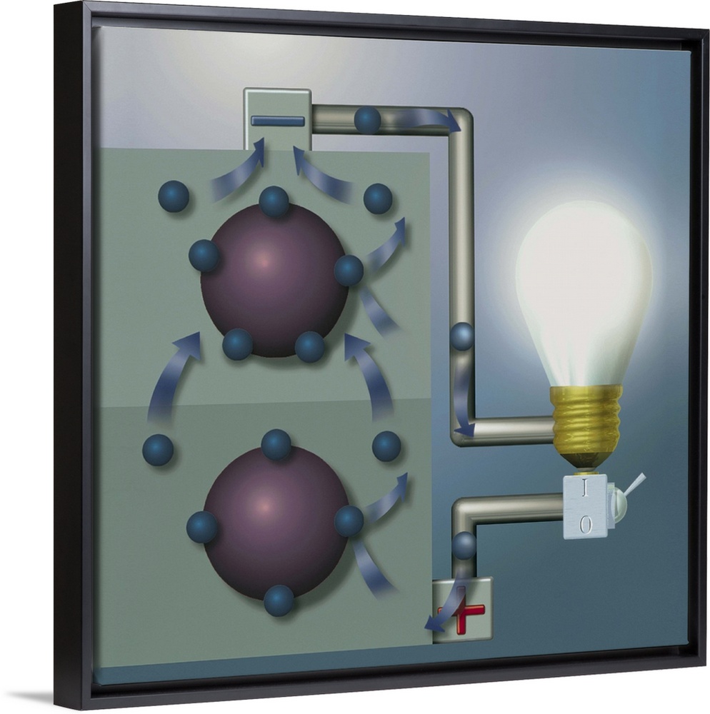 <p>Solar cell (image 3 of 3). Computer illustration of a solar cell discharging. Solar cells convert sunlight into electricity. This cell has 2 layers of silicon (Si, upper & lower left). The top layer also contains phosphorous (P) atoms. Atoms are seen as purple balls. P normally holds 5 outer electrons (e-, blue), while Si holds 4. Sunlight on the top layer releases e- whose places around the P atom are taken by e- from the bottom layer. The e- build-up in the top layer is being dischar- ged as an electric current, lighting up the bulb. For the solar cell's structure and for it charging see images T155/108 and T155/109 respectively.</p>