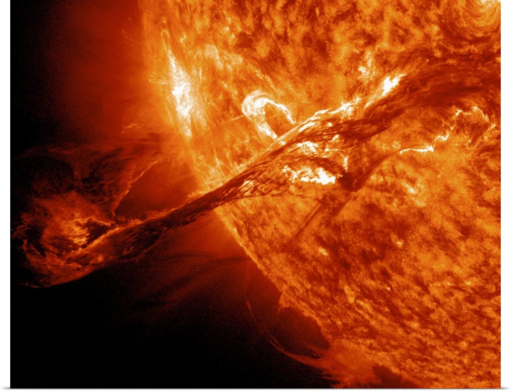 <p>Solar flare, SDO (Solar Dynamics Observatory) ultraviolet (UV) satellite image showing a solar flare and coronal mass ejection (CME) erupting from the surface of the Sun on 31st August 2012. The CME traveled at over 900 miles per second. It did not travel directly toward Earth, but did connect with Earth's magnetic environment, or magnetosphere, causing aurora to appear on the night of Monday, September 3rd, 2012.</p>