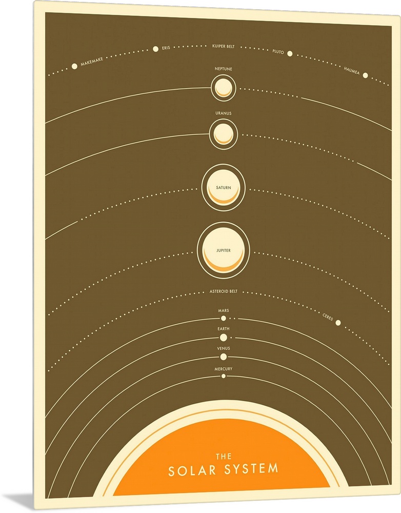 <p>Retro style illustration of the planets in the solar system lined up on a brown background, with each planet labeled with its name and "The Solar System" written across the bottom.</p>