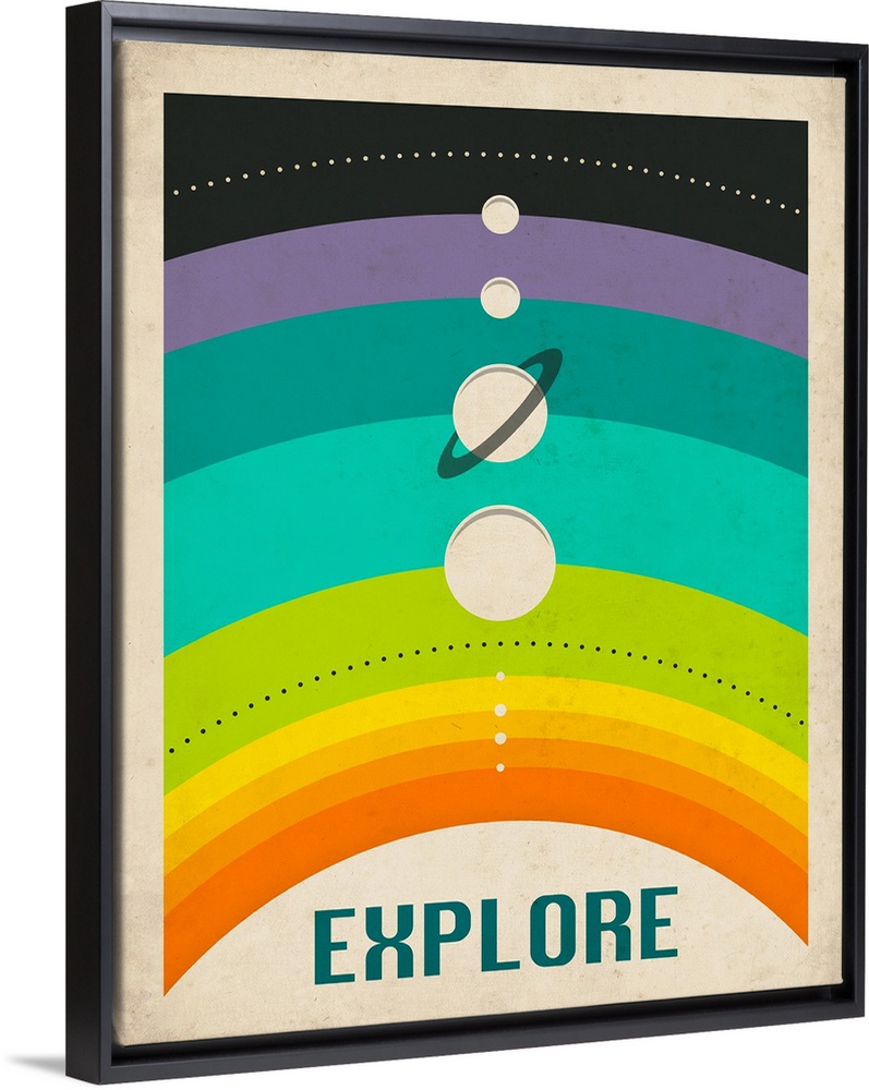 <p>Retro style illustration of the planets in the solar system lined up on a rainbow background with the word "Explore" written across the bottom.</p>