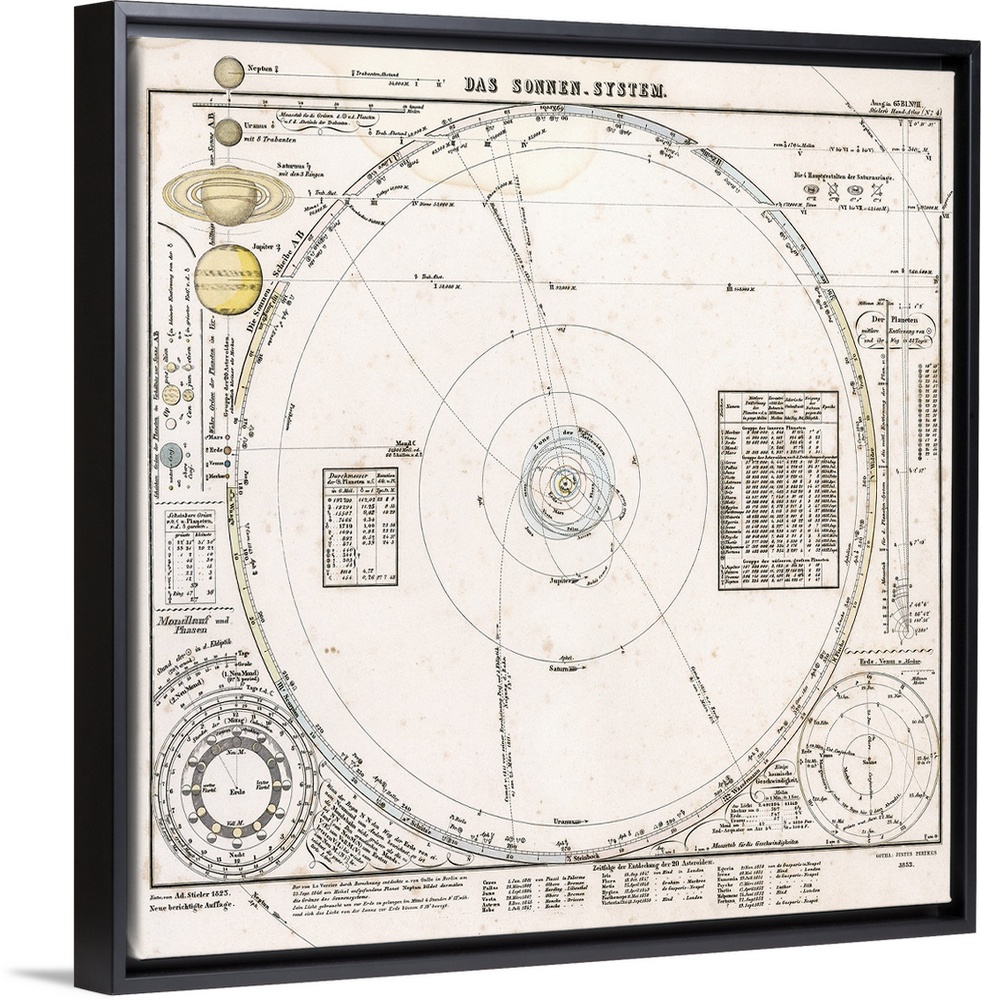 <p>Historical map of the solar system, published in Germany in 1853. The main diagram shows the orbits of the first seven planets out to Uranus. Neptune had been discovered in 1846, but is only shown on the list at upper left. Pluto was not discovered until 1930. The phases of the Moon are illustrated at lower left. Details of Saturn's rings are shown at upper right, while conjunctions of Mercury and Venus are shown at lower right. The main diagram, drawn to scale, shows how the inner solar system is tiny when compared to the vast distances of the outer solar system. The highly elliptical orbits of comets are shown, as well as the asteroid belt.</p>