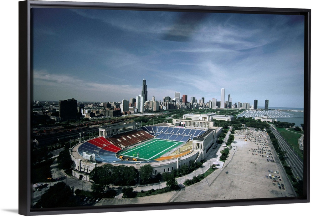 <p>The Chicago Loop skyline can be seen in the background of Chicago's lakefront stadium, Soldier Field.</p>