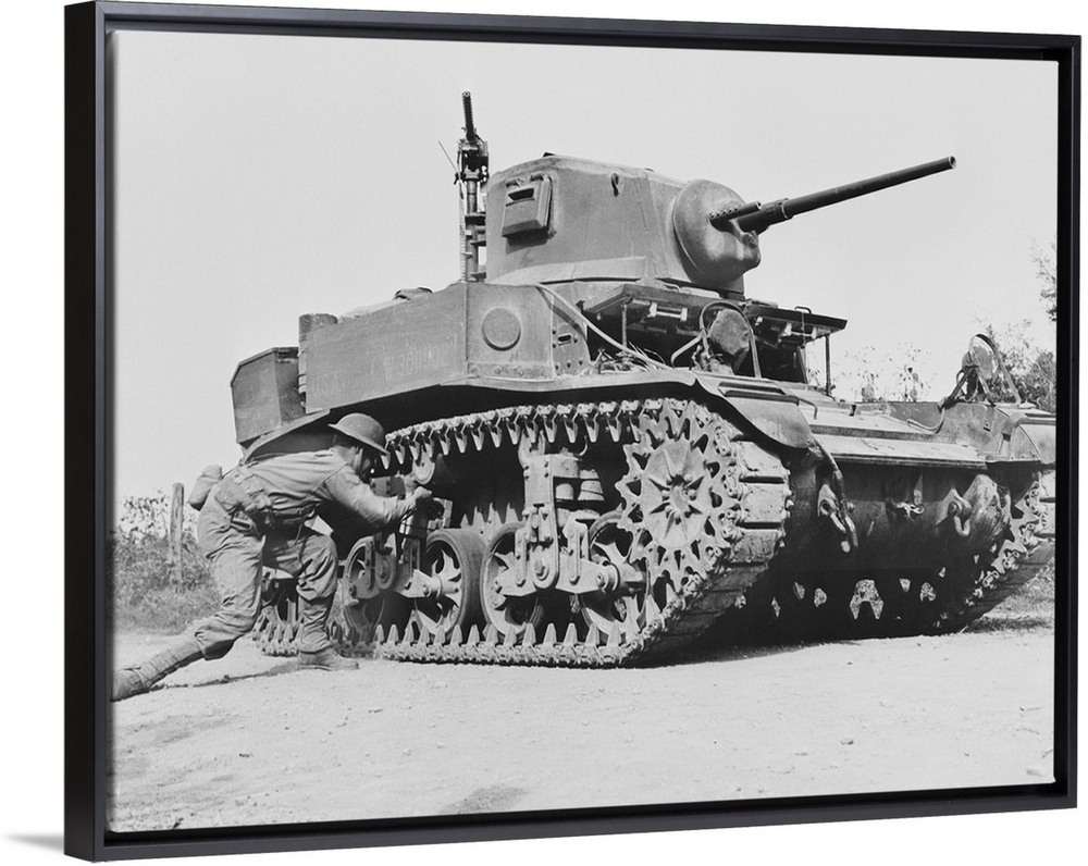 <p>A soldier places a 29 pound TNT statchel charge on the bogey of a light tank during simulated maneuvers with the Second Army in middle Tennessee, circa 1942.</p>