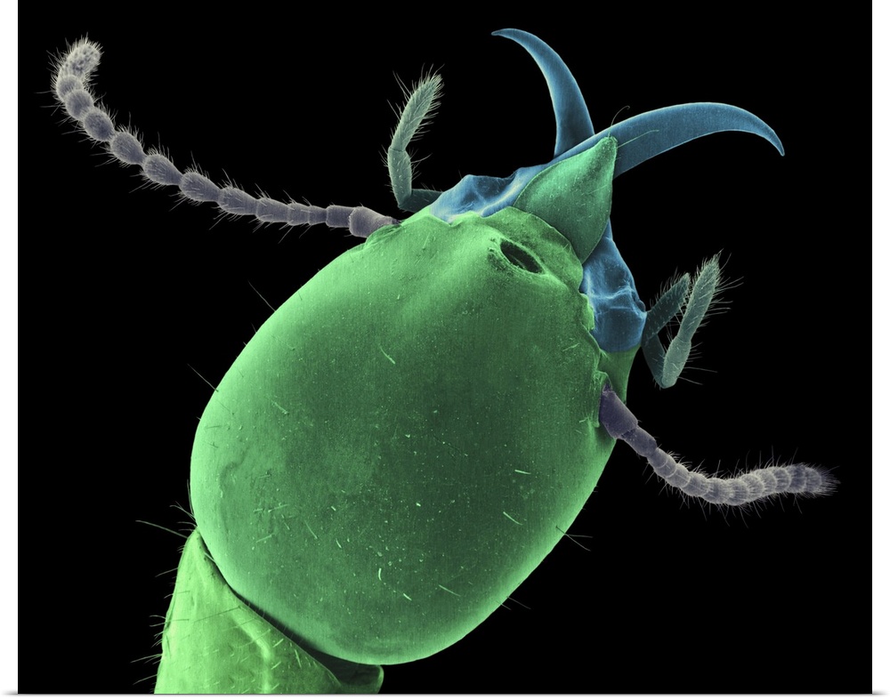 <p>Coloured scanning electron micrograph (SEM) of Formosan (subterranean) soldier termite head (Coptotermes formosanus). The Formosan subterranean termite (Coptotermes formosanus) is a subterranean termite in the family Rhinotermitidae. It is an invasive species of termite and has been distributed worldwide from its native range in southern China to Japan. The Formosan subterranean termite (FST) is know as the super-termite because of its destructive habits. It produces large sized colonies, and the termites can consume wood at a very rapid rate. A single colony may contain several million individuals that forage up to 300 yards in soil. Due to its population size and foraging range the presence of a colony poses serious threats to nearby structures. Magnification: x10 when shortest axis printed at 25 millimetres.</p>
