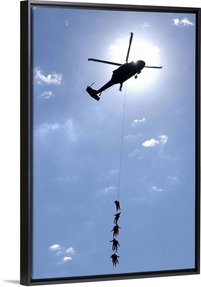 <p>Soldiers and Airmen hang 100 feet above the ground from a UH-60 Blackhawk.</p>