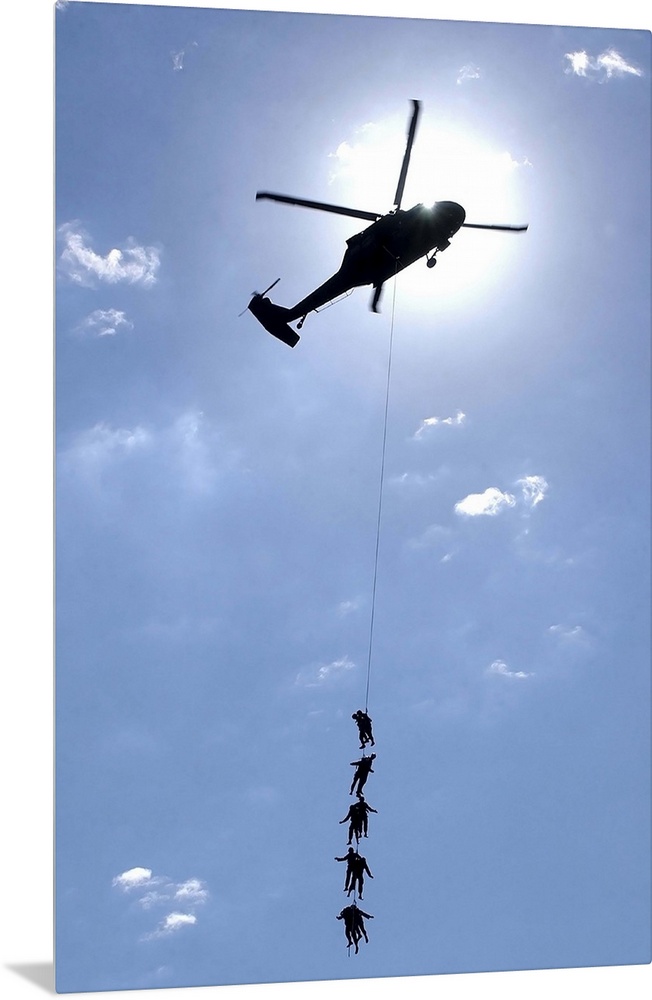 <p>Soldiers and Airmen hang 100 feet above the ground from a UH-60 Blackhawk.</p>