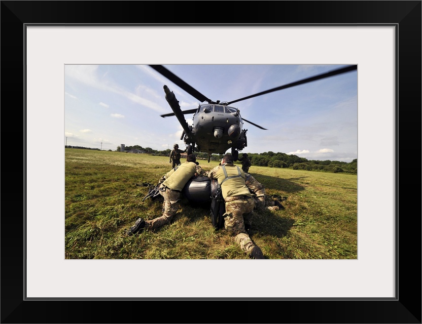 <p>July 24, 2014 - Soldiers mount an inflatable Zodiac boat to the bottom of a HH-60 Pave Hawk helicopter.</p>