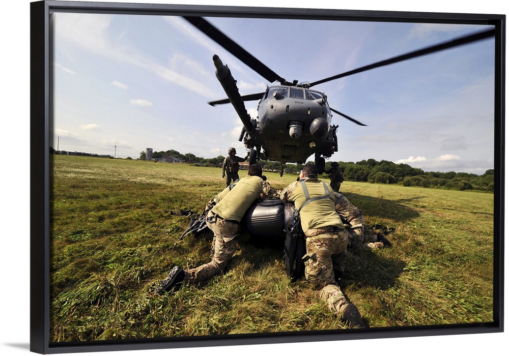 <p>July 24, 2014 - Soldiers mount an inflatable Zodiac boat to the bottom of a HH-60 Pave Hawk helicopter.</p>