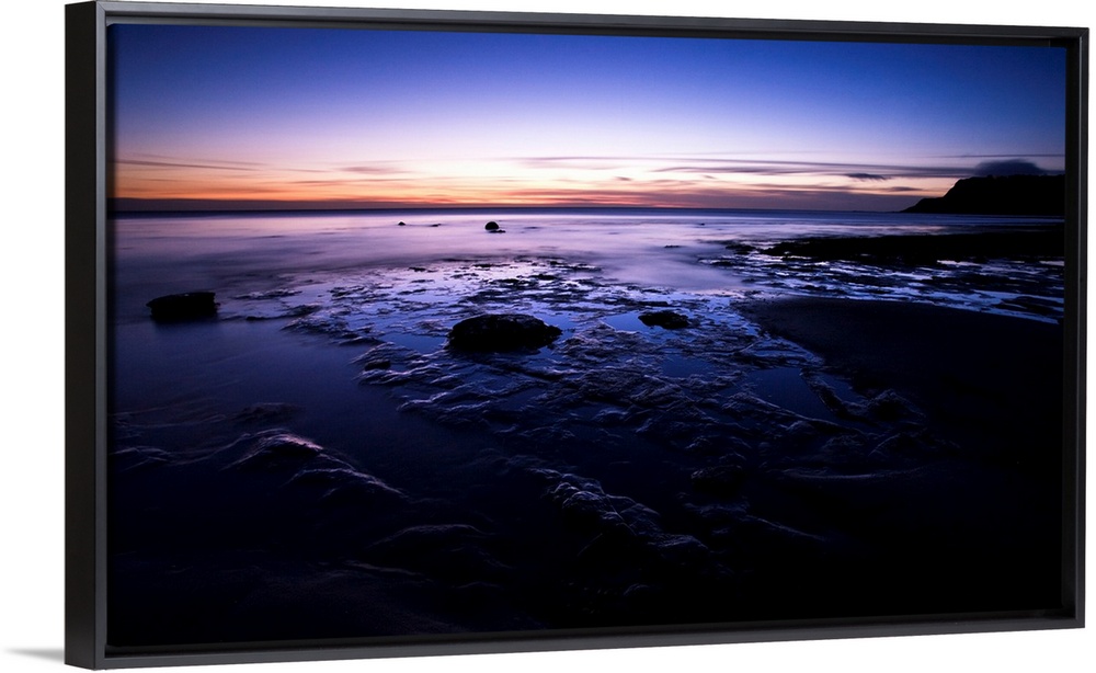 <p>A dramatic seascape at dawn with deep purple magenta pink skies and clouds over wet sands.</p>