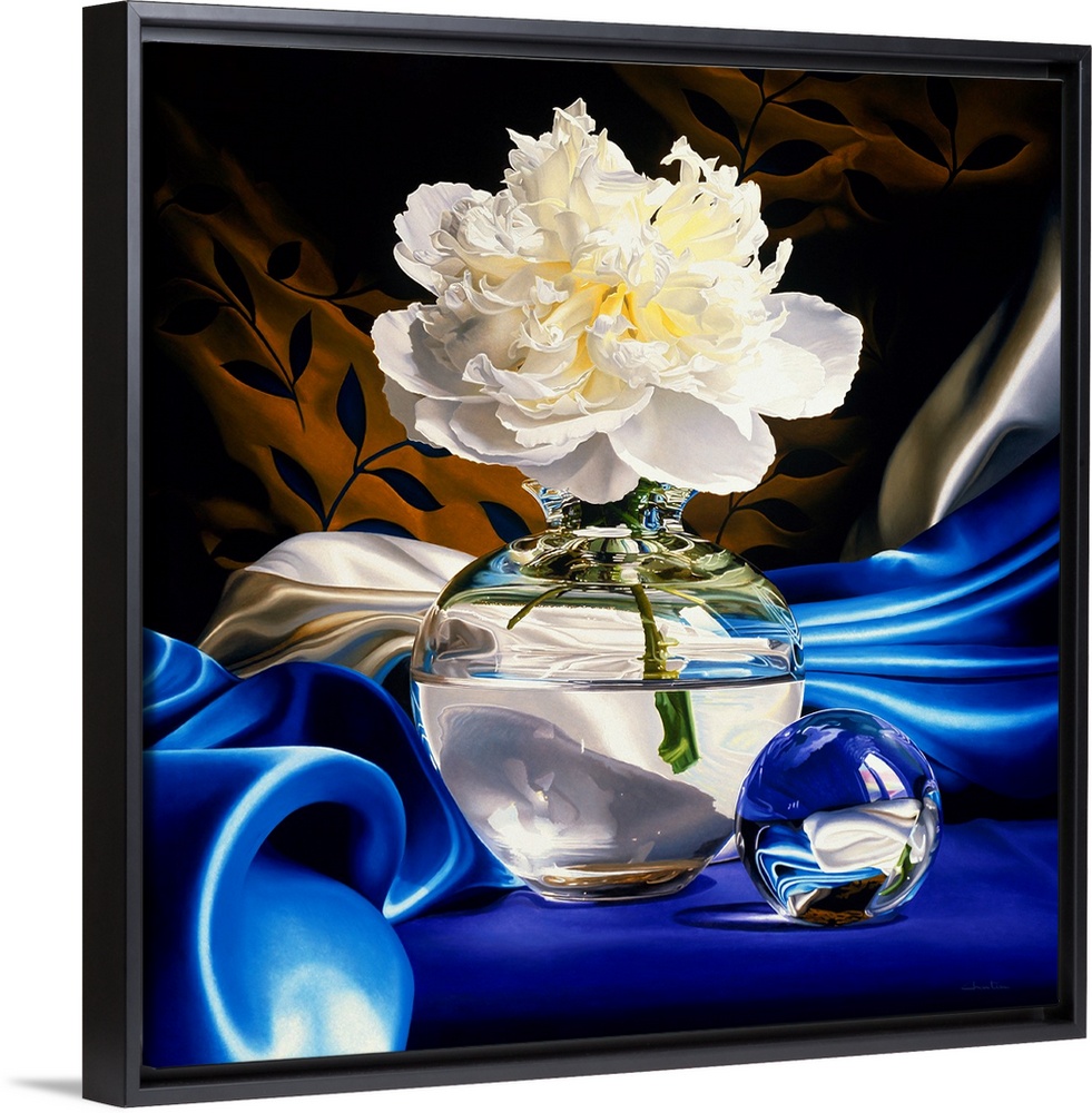 <p>Contemporary vivid realistic still-life painting of a large white flower in a clear glass vase filled with water with a glass orb sitting on a silky looking blue cloth.</p>