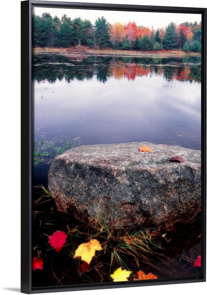 <p>Photograph of huge rock in a pond surrounded by fallen autumn leaves with forest in the distance that is reflected in the pond.</p>
