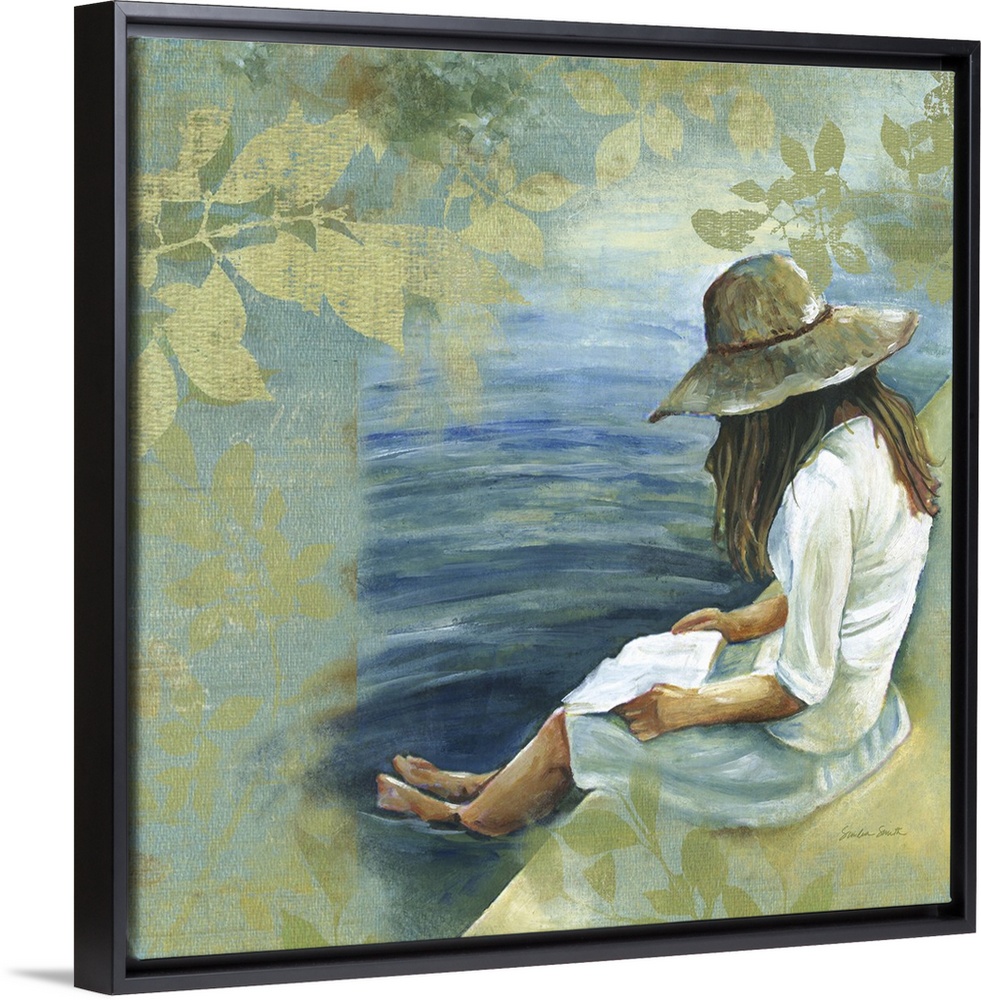 <p>Painting of a woman with a wide-brimmed hat reading a book with her feet in the water.</p>