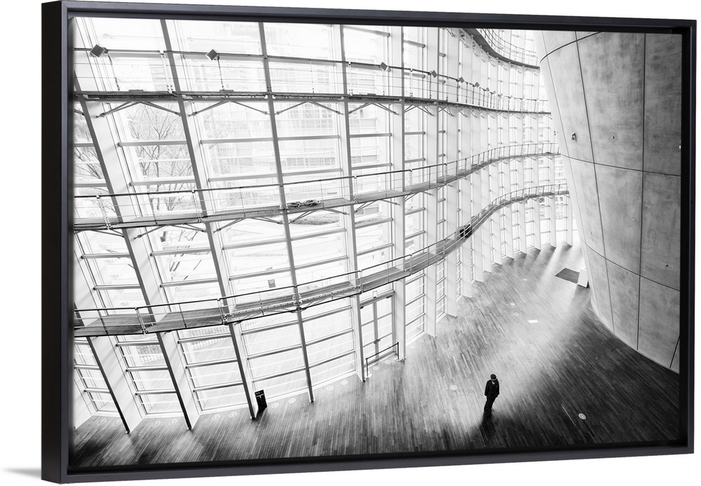 <p>Black and white image of curving architecture, with a lone figure.</p>