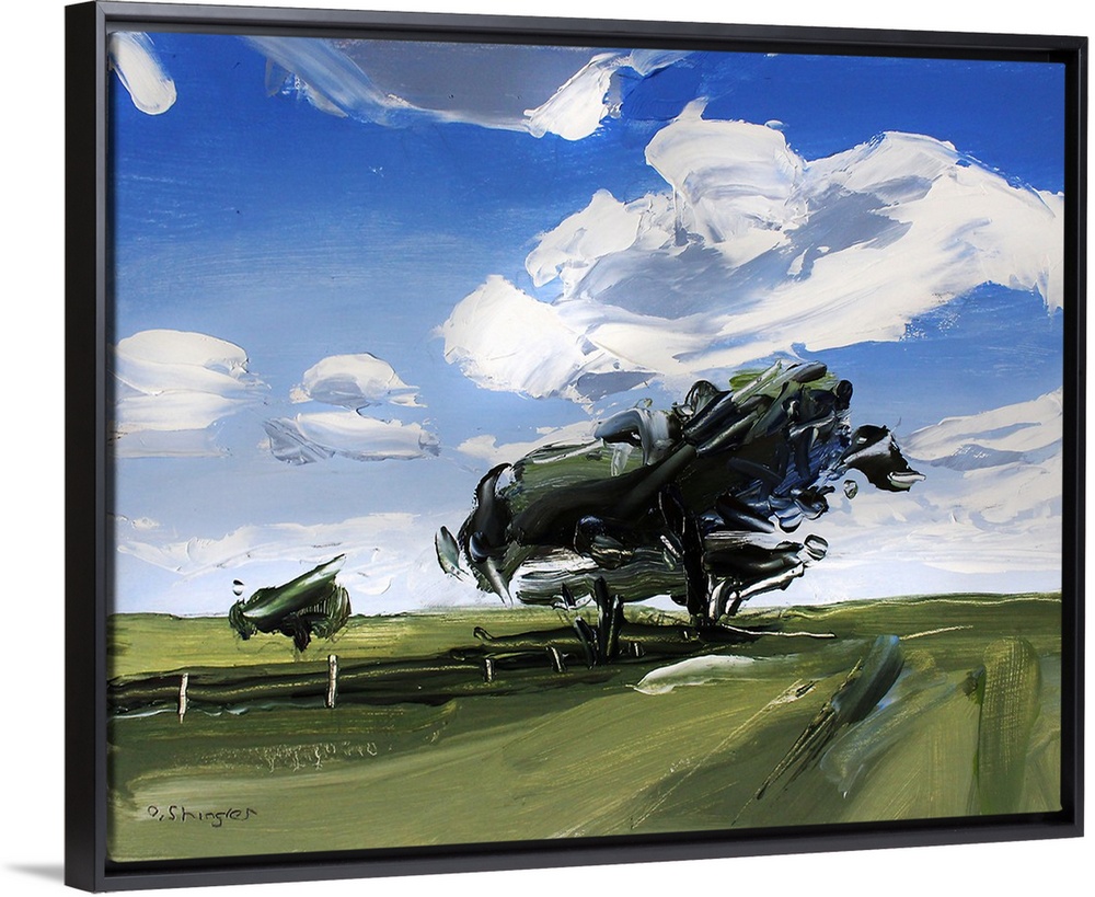 <p>A contemporary painting of a green field with trees under a sky filled with gray clouds.</p>