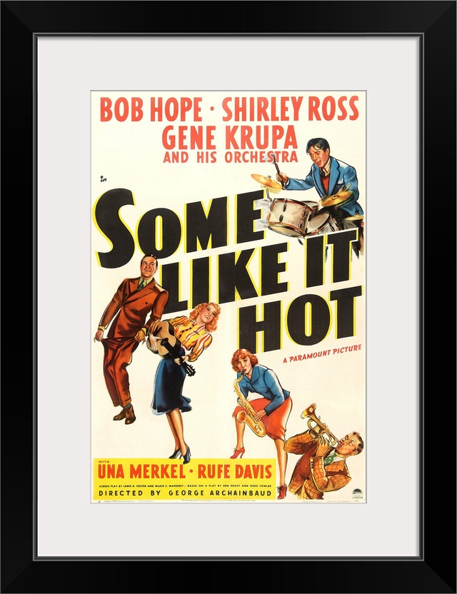 <p>SOME LIKE IT HOT, US poster art, top: Gene Krupa; bottom from left: Bob Hope, Shirley Ross, Una Merkel, Rufe Davis, 1939</p>