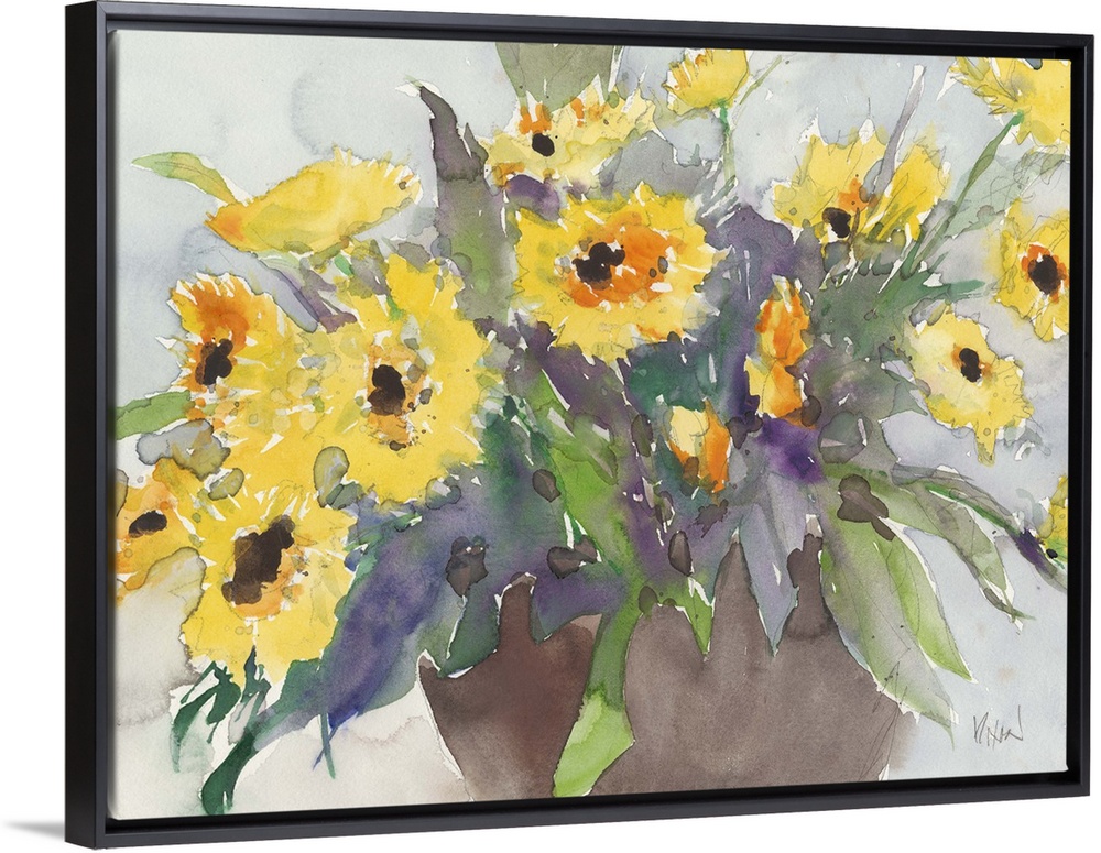 <p>Watercolor painting of bright yellow daisies in a vase.</p>