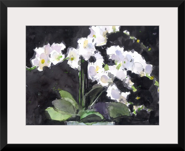 <p>Watercolor painting of white orchids in a vase.</p>
