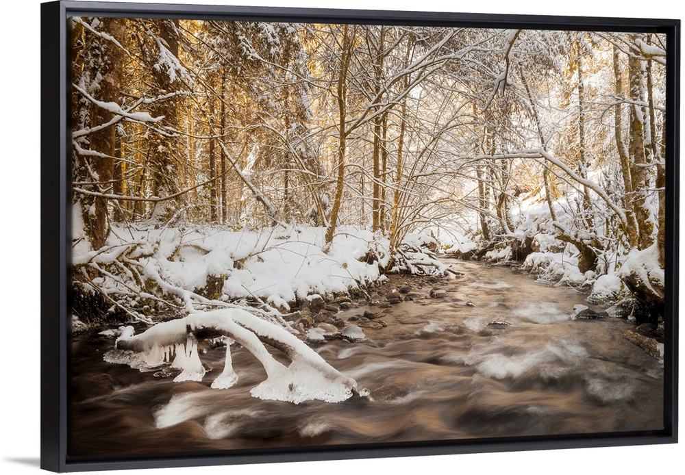 <p>Photograph of a rushing river in the middle of snow covered woods at golden hour.</p>