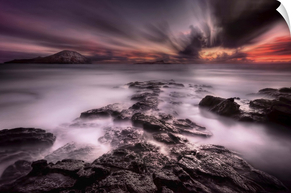 <p>A dramatic view of a rocky coastline looking out to the sea under a blanket of intense clouds.</p>