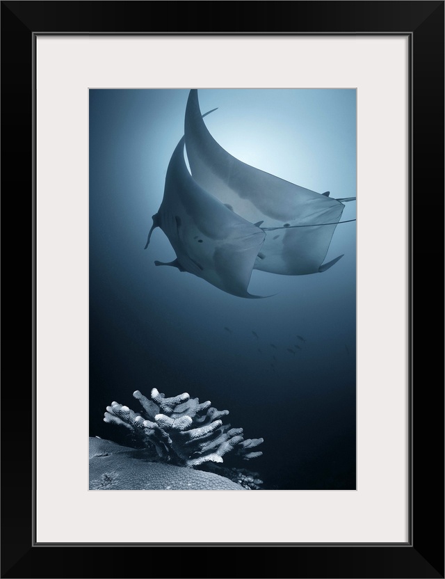 <p>A low angle view of manta rays gliding through the ocean.</p>
