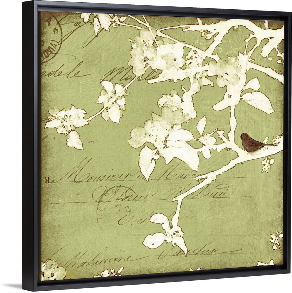 <p>Artwork featuring lettering and postmark overlain with a watercolor like branch and leaf silhouette that has a single bird resting on a limb.</p>