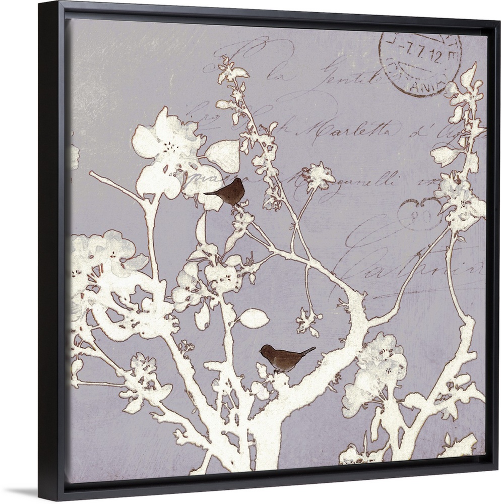 <p>Illustration of two tiny birds sitting on the outlines of flowers and branches, over an address written in cursive and marked with a postal cancellation stamp.</p>