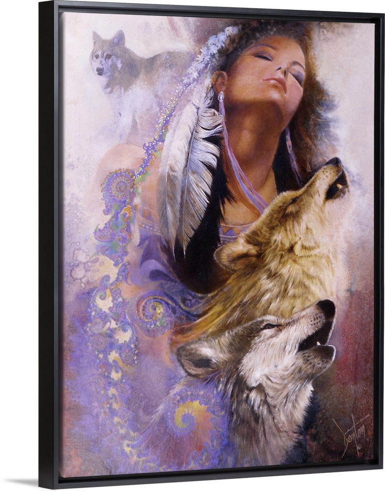 <p>A contemporary painting of a Native American woman with fractals streaming from the feathers in her hair leading down to the images of howling wolves.</p>
