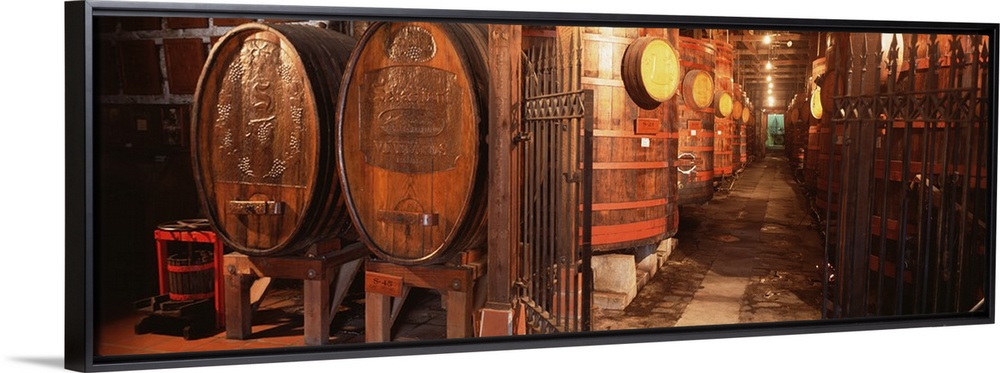 <p>Panorama of a cellar where barrels of aging wine are being kept in controlled temperatures and humidity to achieve the best taste.</p>