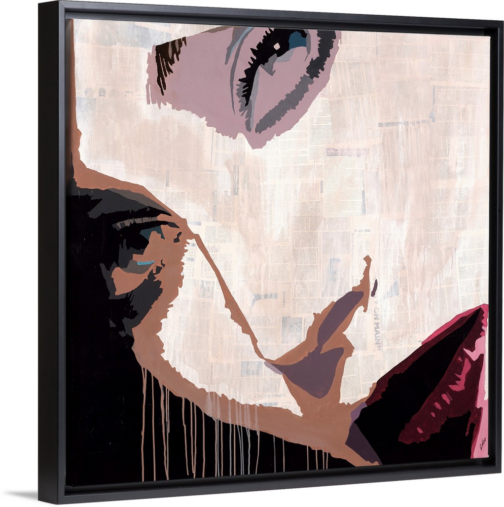 <p>Square artwork with a close-up of a woman's face in red, purple, and brown hues and her skin made with newspaper cutouts on a black background.</p>