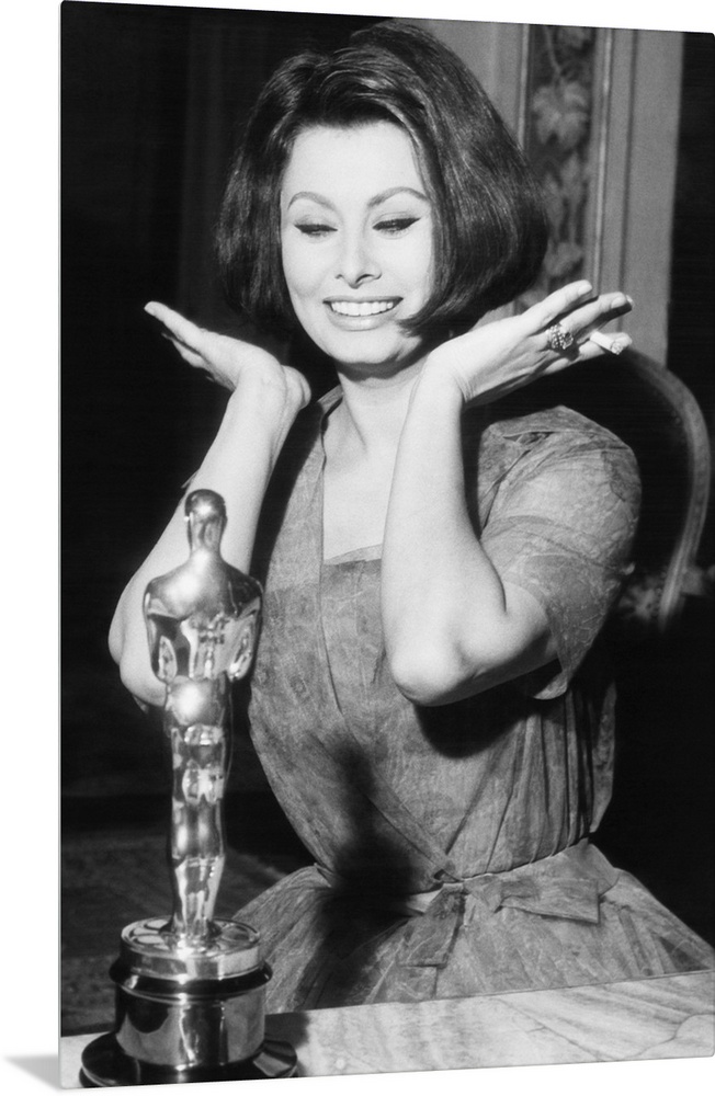 <p>Sophia Loren as she receives the Oscar statuette from producer Joseph Levine in Rome, April 4, 1962. She won the Academy Award for best actress's performance in the 1960 Italian film, TWO WOMEN.</p>